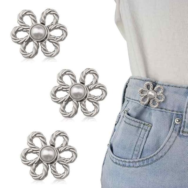 ウエスト 調整 ジーンズ 調整ボタン 【ボタンフラワー3点セット】 シームレス バギージーンズ/パンツ/スカート/Tシャツ/フード付きスウェットシャツ アジャスタブル リムーバブル (ブライト・シルバー 3枚)