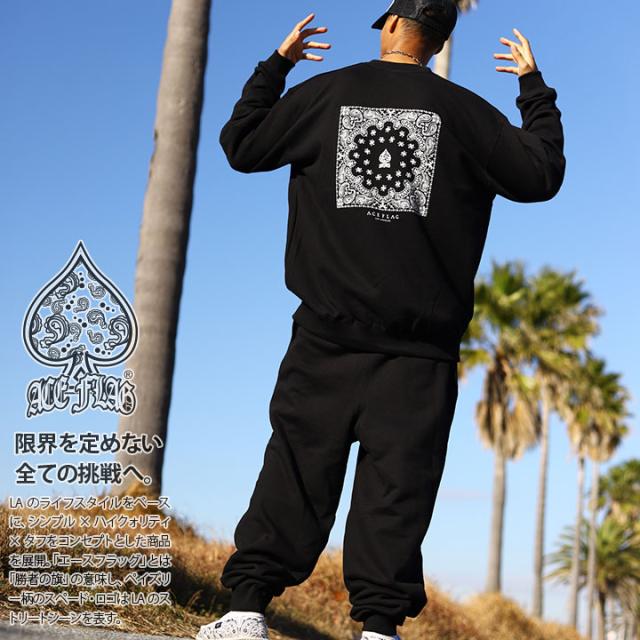 【58%OFF】ACE FLAG 上下セット 長袖 ブランド メンズ 黒 大きいサイズ エースフラッグ セットアップ トレーナー スウェット 裏パイル スウェットパンツ ペイズリー柄 2Pac 筆記体 ビッグシルエット ヒップホップ ファッション ストリート系 AF-SE-SW-118