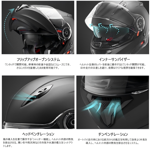 | 特徴 | ●この製品は、フリップアップオープンシステムを搭載し、ワンタッチで開閉可能。 ●インナーサンバイザー機能収納型のサンバイザー。 ヘルメット左側のレバーを前後に操作するとワンタッチ開閉が可能。 日中走行の日差しを避け、夜間はクリアな視界を確保できます。 ●エアーベンチレーション機能 風圧を利用して効率よく外気を導入し、ヘルメット内部の熱気を排出させるシステム。 またこのベンチレーションには、風の導入を任意で操作する「シャッ夕一機能」が裝備されており、寒い冬や雨天時などの冷気や水滴の侵入をシットアウトします。 ●脱着式内装 クッション性・ホールド性の高い内装を採用する事により、ヘルメットに意識することなく走行でき、転倒時に頭部を保護。脱着式なので洗濯可能。 ●ラチェット式バックル あご紐の脱着を容易にするワンタッチバックルを採用。脱着シーンの多いツーリング・通勤・通学時の利便性が向上。オス側は樹脂製を採用する事でヘルメット外部を傷つける心配も少ない。 |