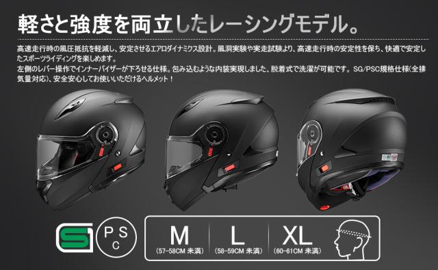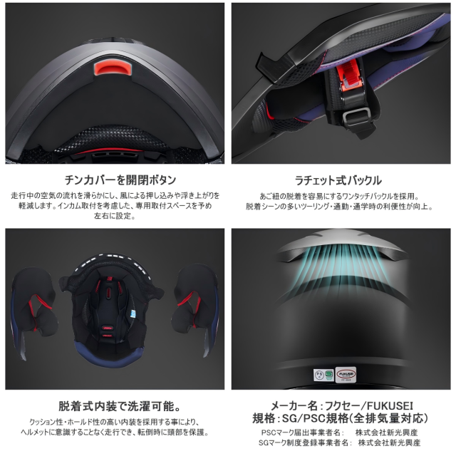 | 製品詳細 | ・チンガードオープンシステム ・インナーバイザー ・可動エアベンチレーション ・内装着脱可 ・クリアシールド ・標準装備 ●規 格:SG/PSC規格(全排気量対応) ●サイズ: M(57-58cm)・L(58-59cm)・XL(60-61cm) ●幅 共通25cm・高さ共通30cm・奥行き共通39cm ●重 量:共通1.7kg ●カラー:マットブラック・艶有りブラック・ホワイト ●メーカー名: フクセー/FUKUSEI ●PSマークの種類:PSCマーク・SG規格 ●届出事業者名: 株式会社新光興産 ●登録検査機関名:一般財団法人製品安全協会 |