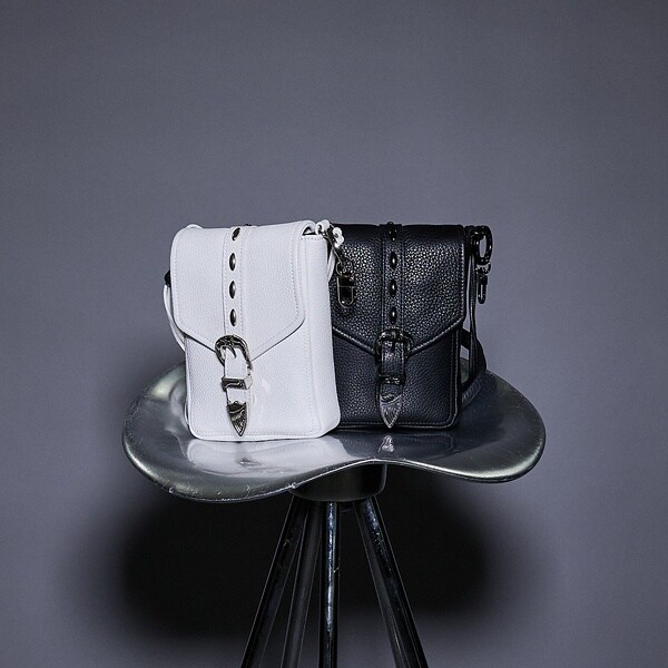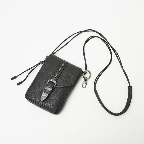 2021年スタートのブランド【waku】との別注モデル。縦型のフラップミニショルダーバッグをベースに、楕円型スタッズとウエスタンバックルをセット。フラップの着脱はマグネットにし、機能性も備えたデザイン。スマートフォンやミニウォレットをミニマムに収納できるほか、背面のファスナーポケットには交通系カードも収納できます。両サイドでヒモの長さを調節可能なレザーショルダーは全長132センチで、取り外し可能なのキーリングが付属されています。機能性と実用性を兼ね備えており、男女問わずユニセックスでご使用いただけます。