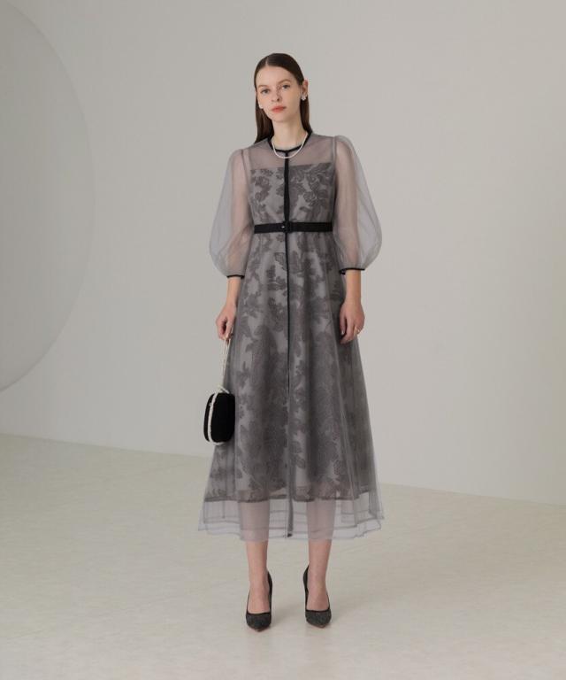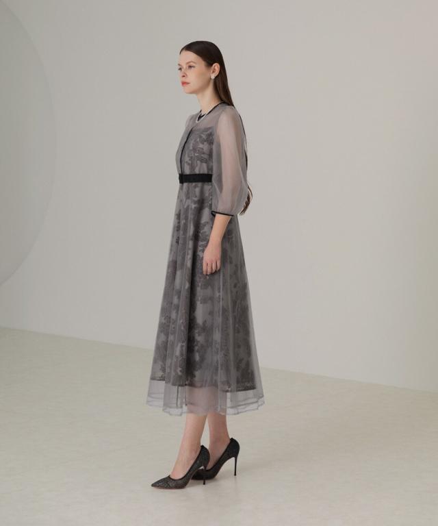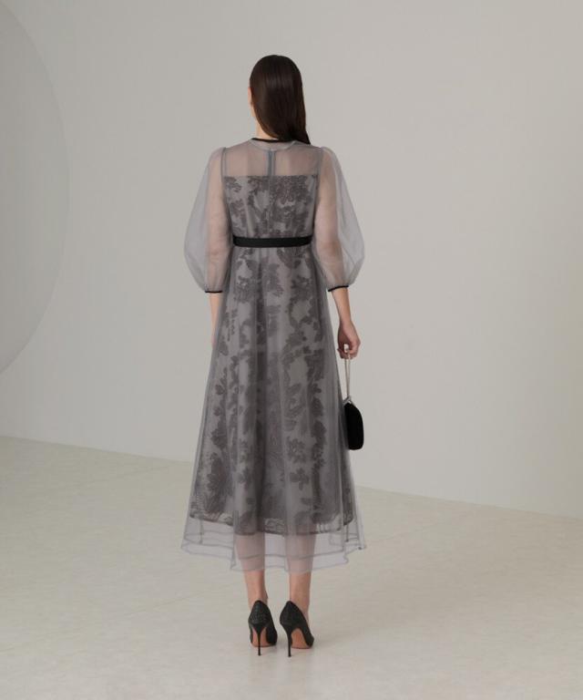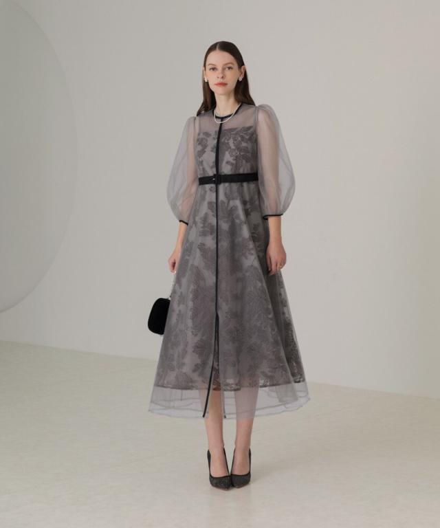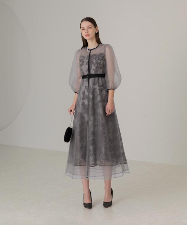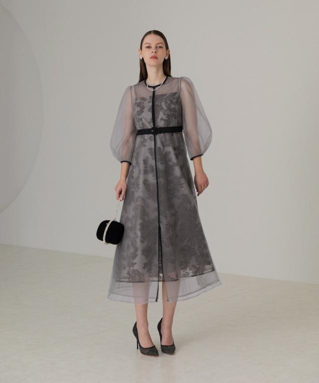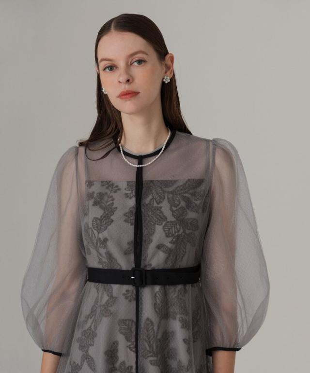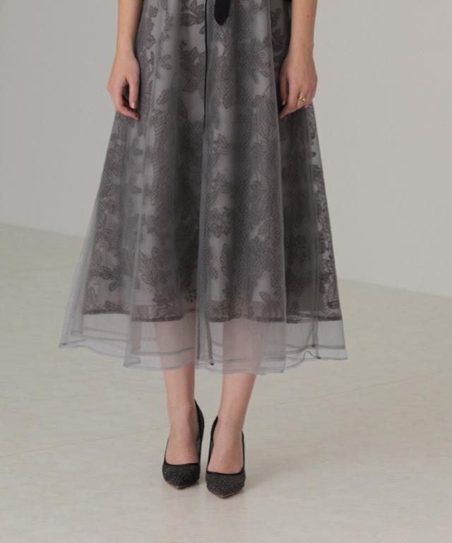 光沢感と透け感のあるチュールが、軽やかさを演出。そしてインナーにはリーフ刺繍を施しフェミニンな印象を演出してくれます。