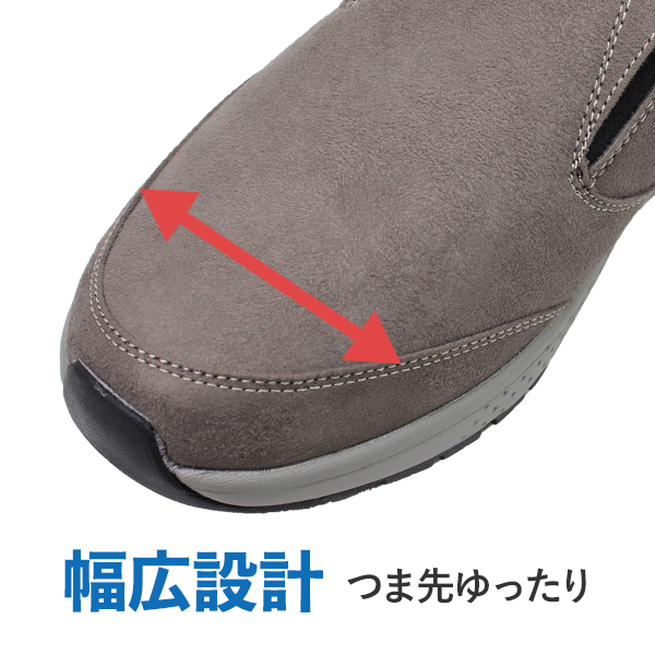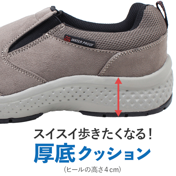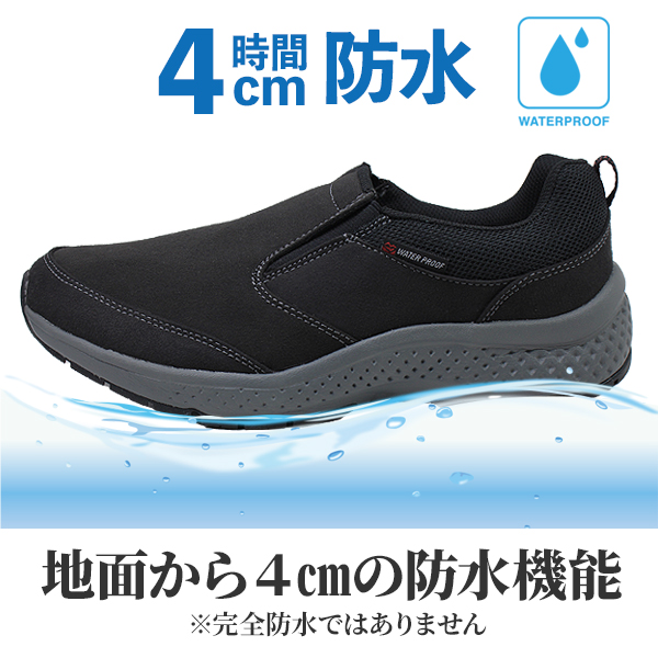 つま先がゆったりした幅広4E設計の防水スニーカーです。屈曲性が良くて歩きやすい、軽快な履き心地のスリッポンです。