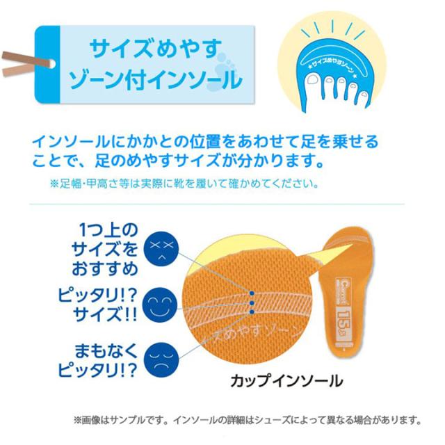 中敷きにはサイズ選びに役立つ「サイズめやすゾーン」を搭載しています。