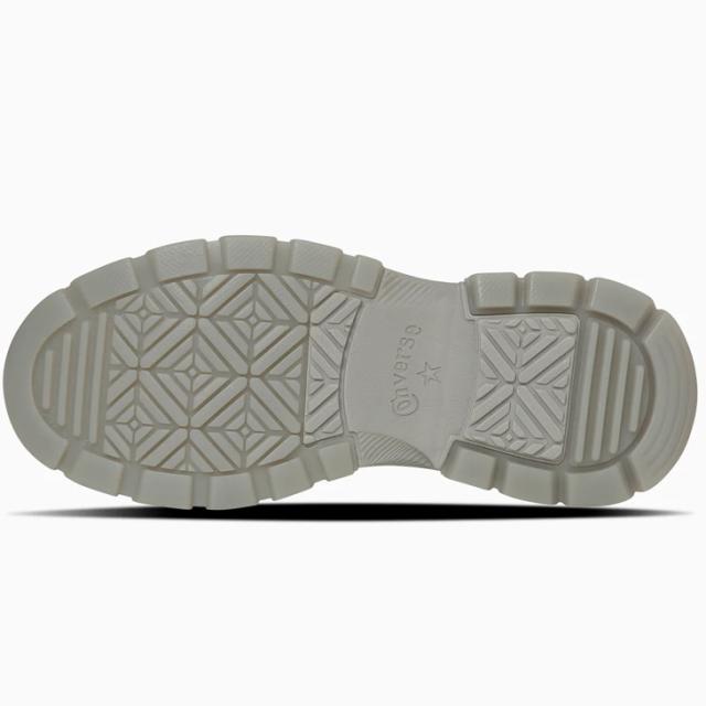全体をモノカラーでまとめつつ、半透明のアウトソールやスエードのタンラベル、