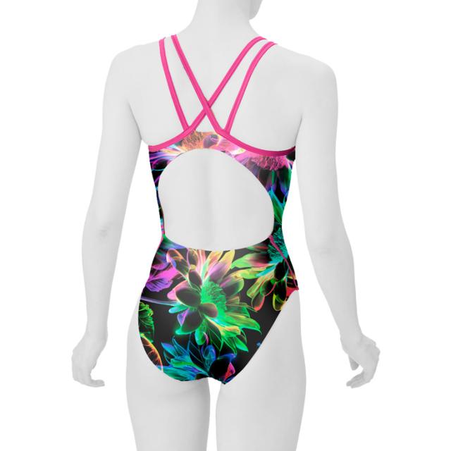 WATER ILLUSIONテーマ柄の練習水着です。肩紐を2本にすることで、