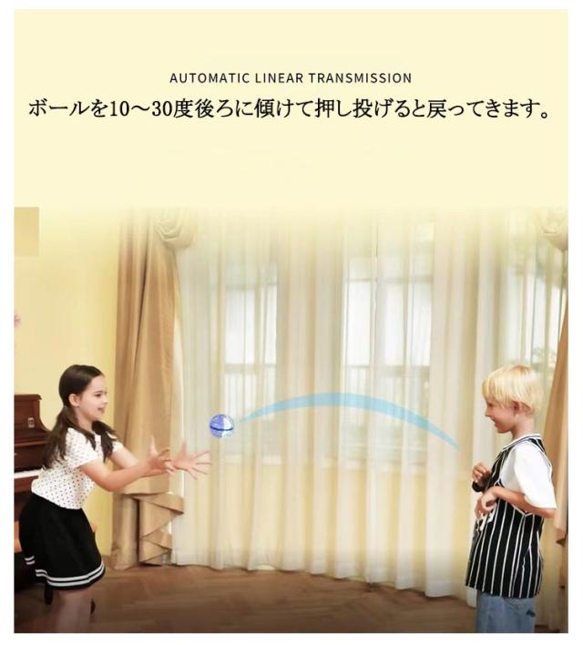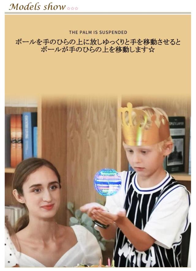 | サイズについての説明 | コツをつかめばブーメランのように戻ってきたり、まっすぐに飛んで行ったり、空中で静止したりと触れれば触れるほど楽しくなっていく不思議なボール! 充電式でスイッチをONにして軽く振るとプロペラが回転してスタートします。力を入れなくても少し押し出すだけで「スー」と飛んでいきます。 暗闇の中で鮮やかに光る姿はまるでUFOのよう。素材はポリプロピレンで壁や床なども傷つけにくく、かつ強度があります。 最長どこまで飛ばせるか競う、ボーリングのようにピンを倒すなど、自由に考えて遊べます。 |