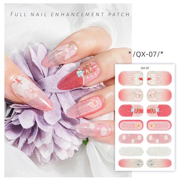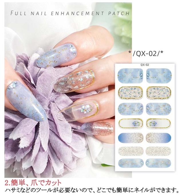 | サイズについての説明 | 5シート入り(70枚セット) 【ご使用前に】 ●爪に油分や水分、汚れが付着しているとが剥がれやすくなりますので、爪の表面をキレイに拭き取ってください。 ●甘皮を処理し、付属のファイルなどで爪の形や表面を整えるとよりキレイに仕上がります。 ●シートからネイルを剥がす際にはシートの外側部分を持って剥がしてください。 (1)製品を爪に合わせ、爪よりも少し小さめのネイルをお選びください。 (2)キューティクルラインと1mmほどの余裕があるところにネイルを貼ってください。 (3)ネイルを貼って余りのは爪の形に合わせて折ってください。 ファイルを利用して、爪の下の方向に向けて余りのネイルを削ってください。 (4)お好みの硬化方法を選んでください。 ・寝る前に貼り硬化する場合 ・自然光で硬化する場合:約2時間(自然光が多い室内と室外にて) ・UV&LEDライトで硬化する場合:約30秒 【剥がし方】 ●ウッドスティックでキューティクルラインからゆっくり押出しながら剥がしてください。 |