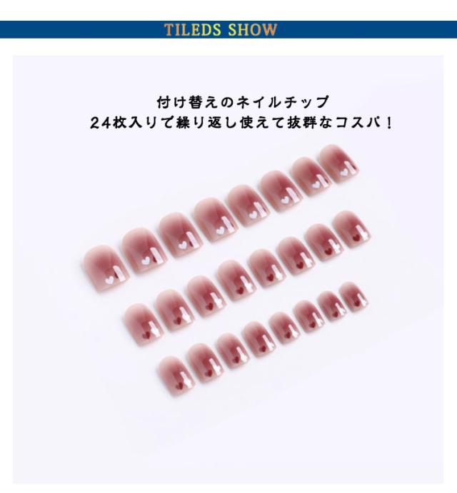 | 大人可愛い印象を作り出すネイルチップ。 血色感を引き立てる柔らかなピンク系。 ハートモチーフのアクセントが加わることで、可愛らしさと女性らしさを引き立てるデザインとなっています。 付け替えのネイルチップ24枚入りで繰り返し使えて抜群なコスパ! 日常生活から、卒業式、結婚式、パーティー、お誕生日、あらゆる場面で使える。 | |