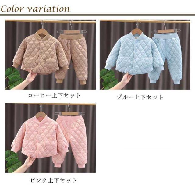 | 80-130cm!防寒性抜群な中綿セットアップ♪ 中にはふわふわ綿を入れており防寒性抜群♪ 普段は着用、通学、イベンドなどの場でも気軽に装着できます。 セットで着ても、別々で着てもOKなので、お手持ちの服と合わせるとよりコーデの幅が広がります パジャマやルームウエアとしてはピッタリ♪ お出かけでも大丈夫のスタイルです。 寒い冬でも過ごせる上下セット♪ | |