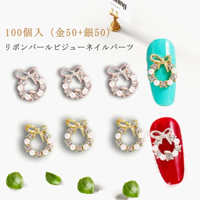 | 100個入(金50+銀50) リボンパールビジューネイルパーツ | |
