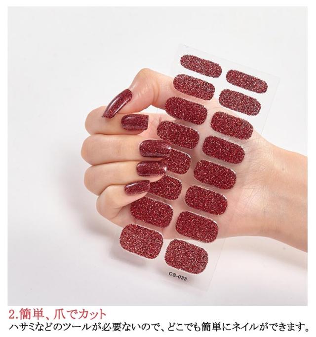 | サイズについての説明 | 10シート入り(160枚セット) 【ご使用前に】 ●爪に油分や水分、汚れが付着しているとが剥がれやすくなりますので、爪の表面をキレイに拭き取ってください。 ●甘皮を処理し、付属のファイルなどで爪の形や表面を整えるとよりキレイに仕上がります。 ●シートからネイルを剥がす際にはシートの外側部分を持って剥がしてください。 (1)製品を爪に合わせ、爪よりも少し小さめのネイルをお選びください。 (2)キューティクルラインと1mmほどの余裕があるところにネイルを貼ってください。 (3)ネイルを貼って余りのは爪の形に合わせて折ってください。 ファイルを利用して、爪の下の方向に向けて余りのネイルを削ってください。 (4)お好みの硬化方法を選んでください。 ・寝る前に貼り硬化する場合 ・自然光で硬化する場合:約2時間(自然光が多い室内と室外にて) ・UV&LEDライトで硬化する場合:約30秒 【剥がし方】 ●ウッドスティックでキューティクルラインからゆっくり押出しながら剥がしてください。 |