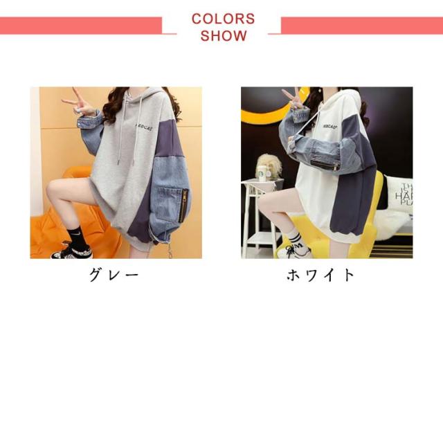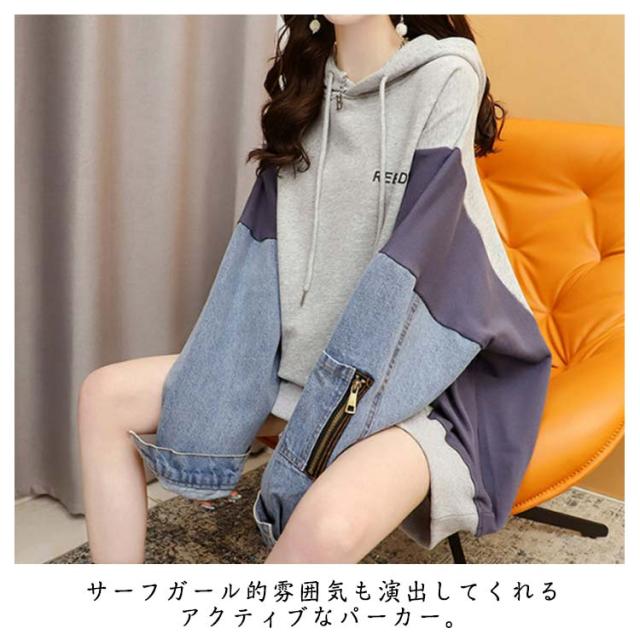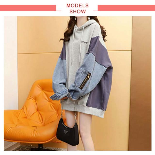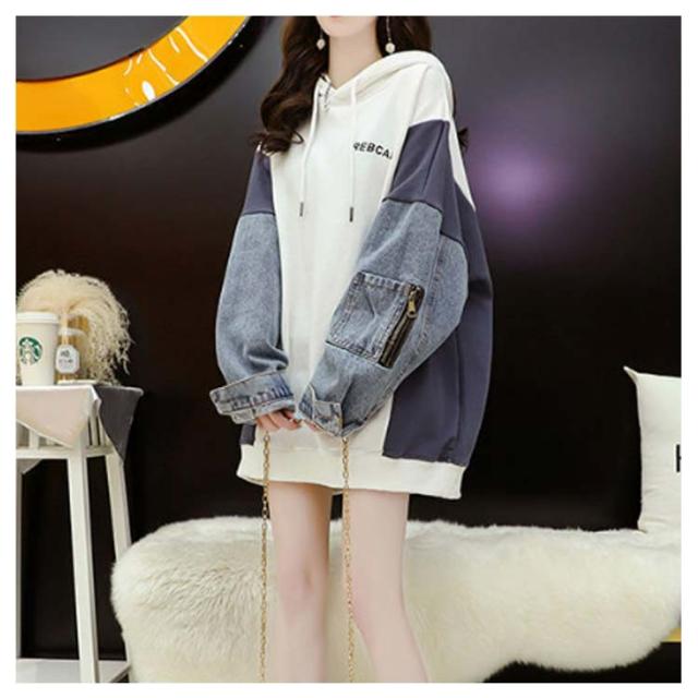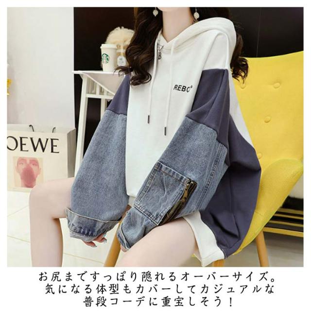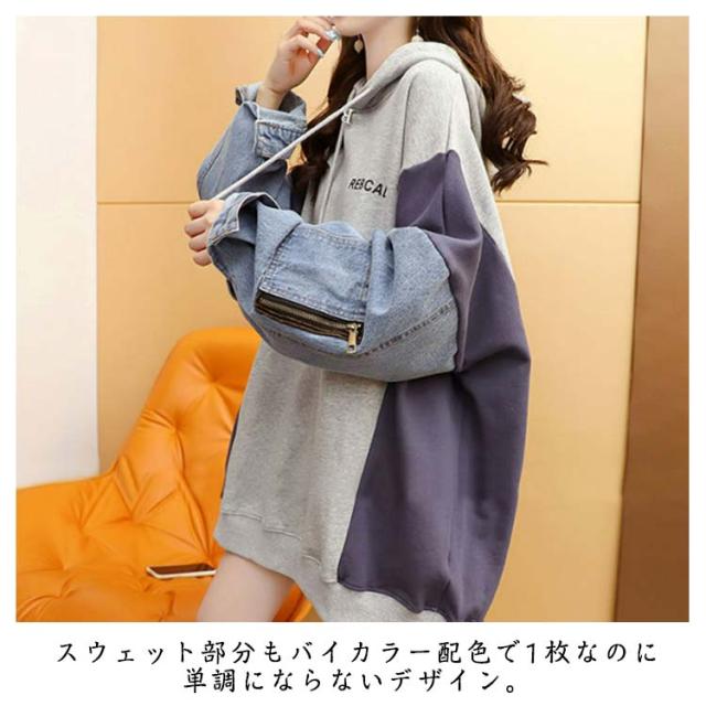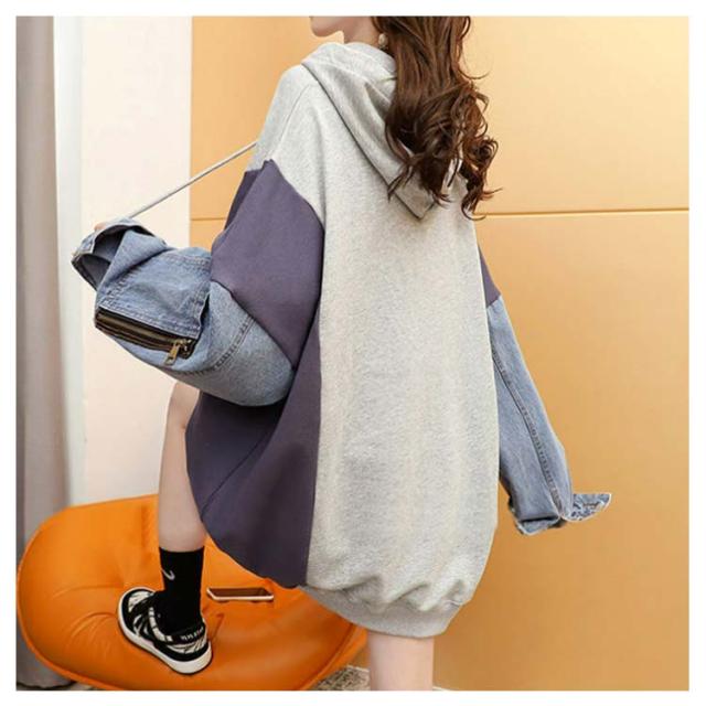 オーバーサイズ デニム切り替え レディース 大きめ おしゃれ パーカー トップス 切り替え 体型カバー デニム スウェットフード付きトレーナー 可愛い ロング丈 カジュアル ゆったり 大きいサイズ 個性的 パーカー 秋冬 秋 冬 韓国ファッション