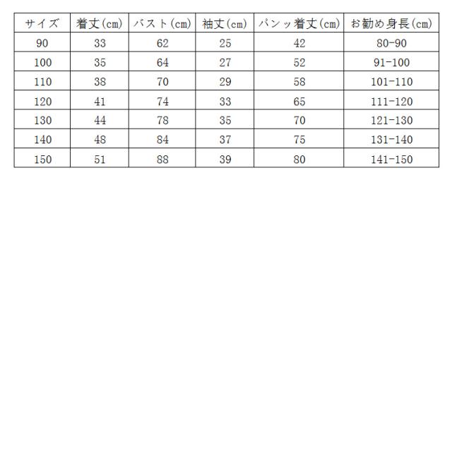 | サイズについての説明 | サイズ 着丈 バスト 袖丈 パンツ丈 お勧め身長 ※サイズ表の実寸法は商品によって1-3cm程度の誤差がある場合がございます。 |
