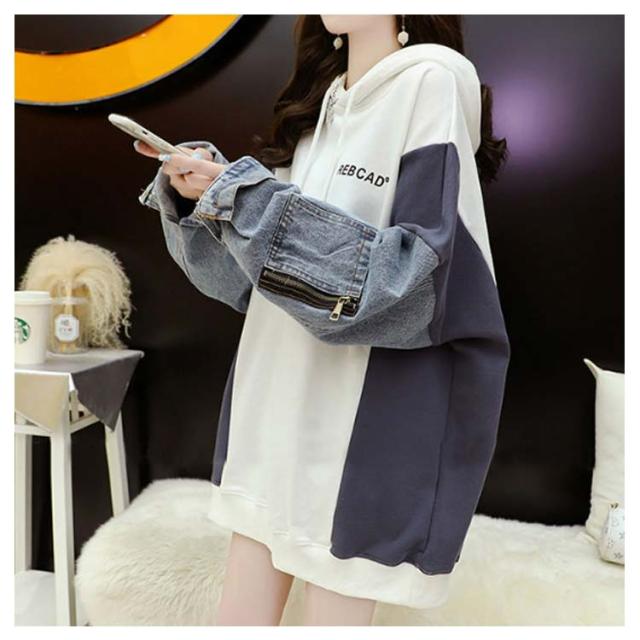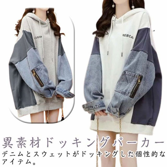 パーカー レディース 大きめ デニム切り替え おしゃれ オーバーサイズ トップス 長袖 切り替え デニム スウェットフード付きトレーナー 大きいサイズ ロング丈 カジュアル ゆったり 体型カバー 個性的 可愛い 秋冬 秋 冬 韓国ファッション 送料無料