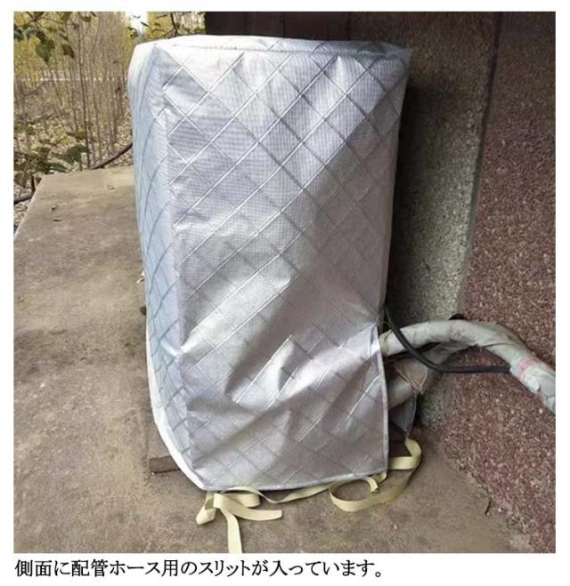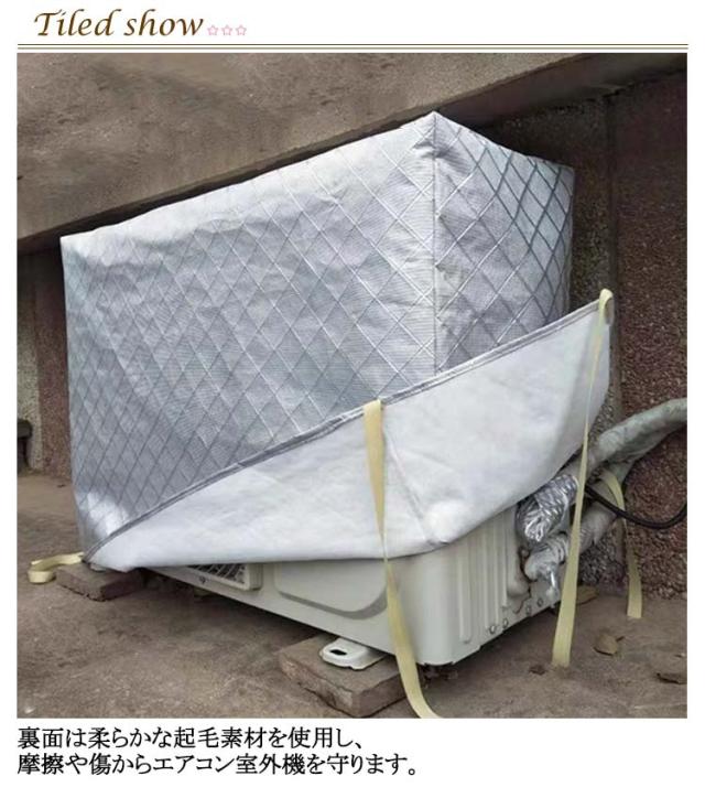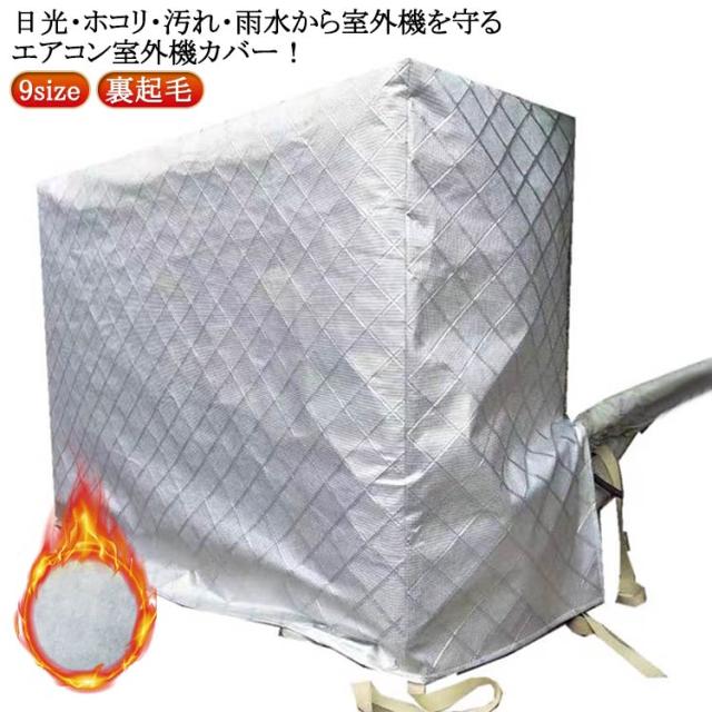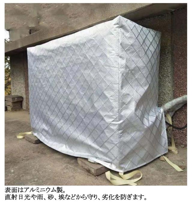 | 9size 日光・ホコリ・汚れ・雨水から室外機を守るエアコン室外機カバー! 表面はアルミニウム製。直射日光や雨、砂、埃などから守り、劣化を防ぎます。 裏面は柔らかな起毛素材を使用し、摩擦や傷からエアコン室外機を守ります。 側面に配管ホース用のスリットが入っています。 防水仕様なので雨風が当たる屋外でも安心してご使用いただけます。 エアコン室外機の上からかぶせるだけ取り付け簡単。 結び紐もついているから、風で飛ばされる心配はありません。 | |