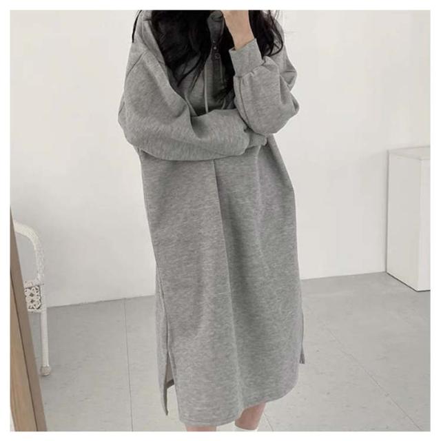 ワンピース スリット入り ロング丈 無地 長袖 パーカーワンピース フード付き 春ワンピ パーカー ワンピース プルオーバー スエット ワンピ ゆったり マキシ丈 可愛い 膝下 スウェットワンピース ルームウェア リラックス ルームウェア 体型カバー 春 秋 春服