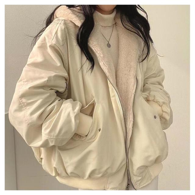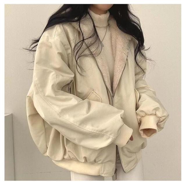 | リバーシブルのフード付きボアジャケット オーバーシルエットながらも女性らしさのある色味とサイズ感にも注目◎ | |