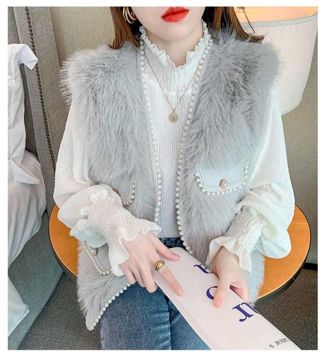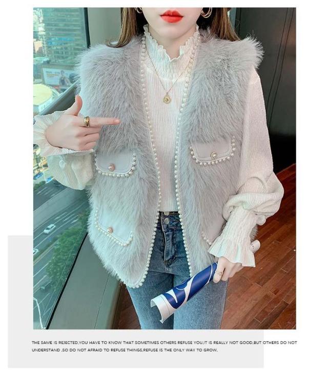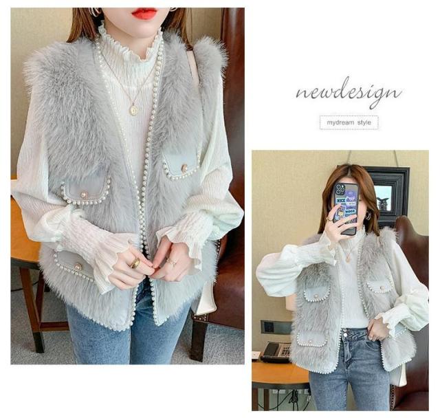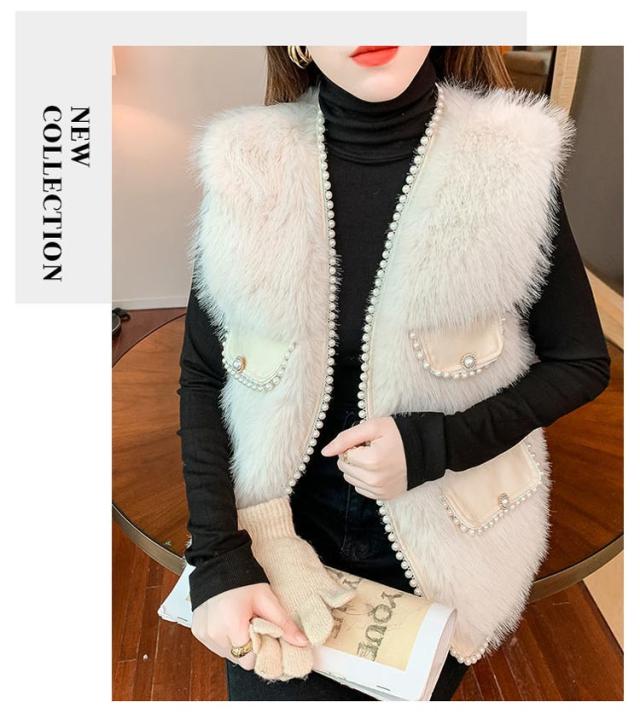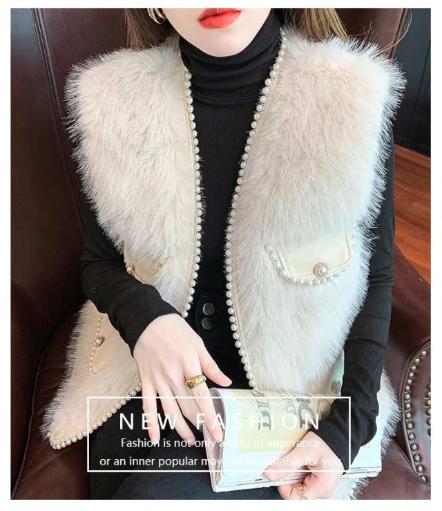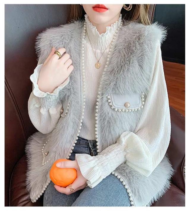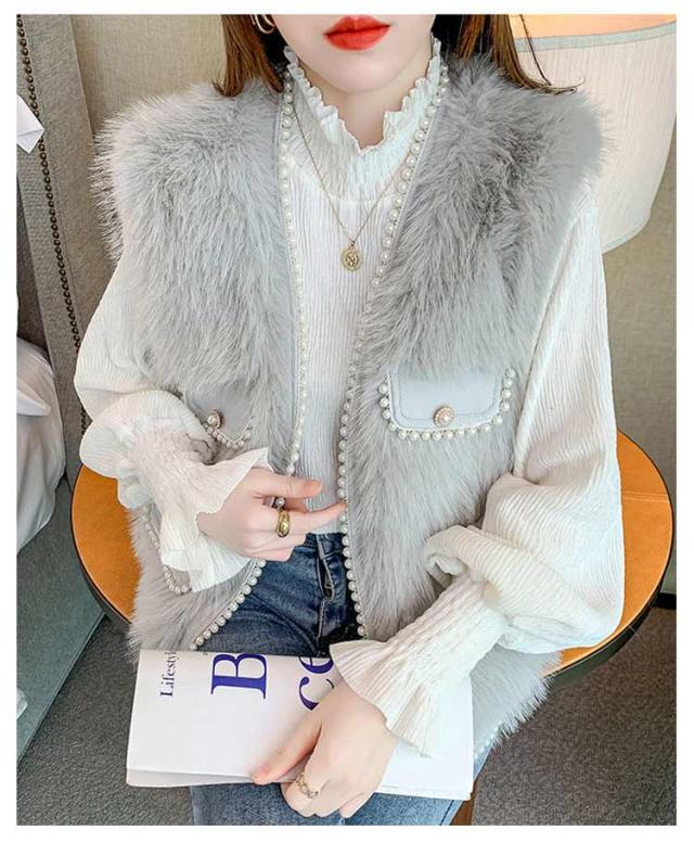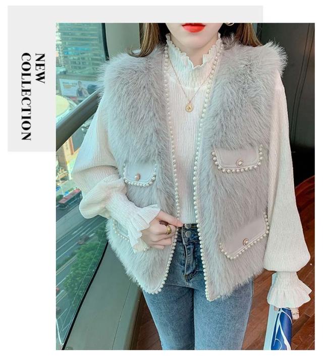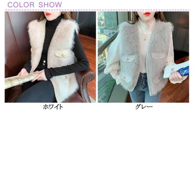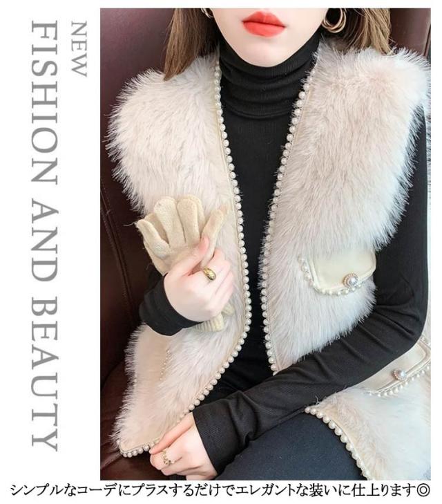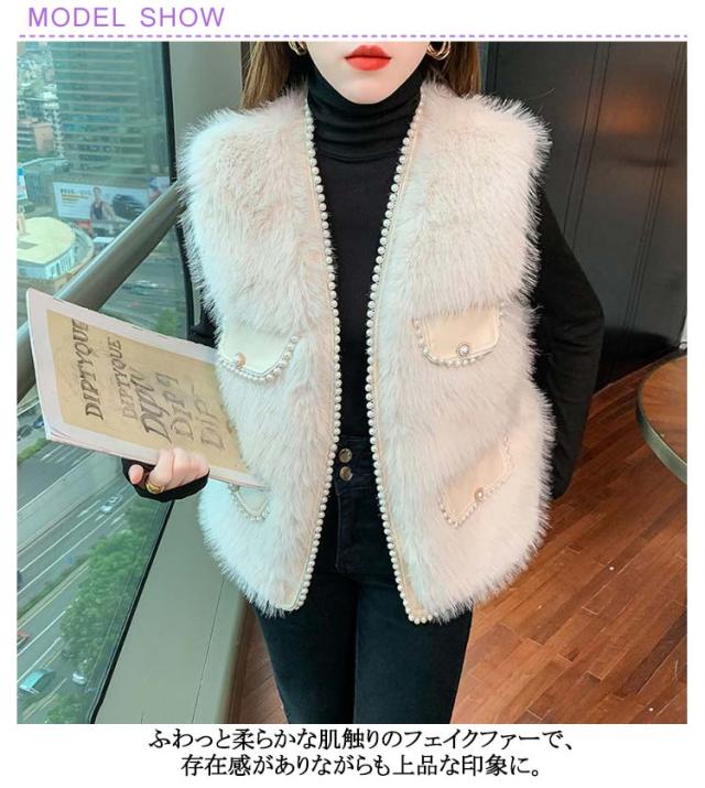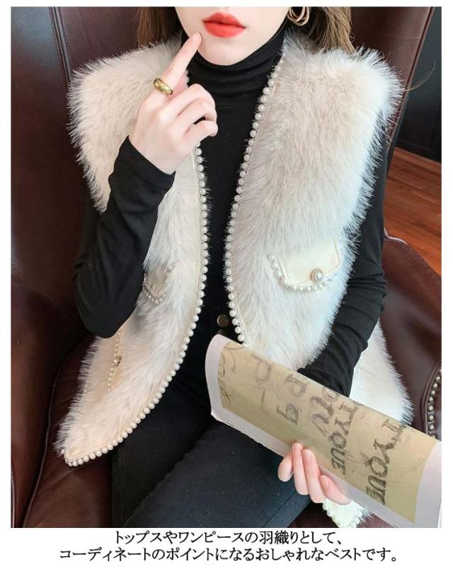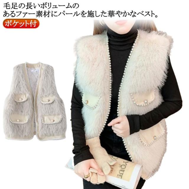 ファーベスト パールデザイン 羽織り レイヤード レディース フェイクファー ジレ ベスト ポケット付 カーディガン ボレロ ファージレ アウター ノーカラー ジャケット ふわふわ もこもこ 大人 カジュアル キレイめ デイリー 送料無料 ファーベスト