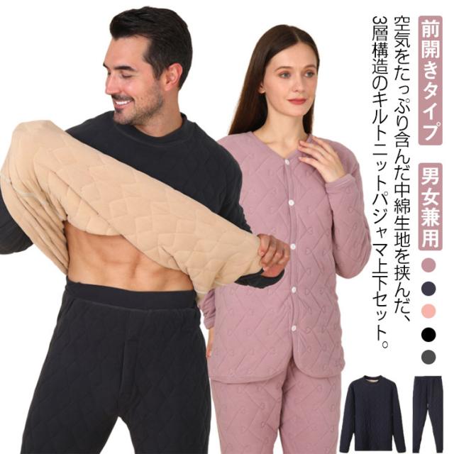 | 空気をたっぷり含んだ中綿生地を挟んだ、3層構造のキルトニットパジャマ上下セット。【前開きタイプ】【男女兼用】 軽い肌あたりで体をやさしく温めながら、優れた吸放湿性でさらっと快適な着心地です。 丸首の前開きタイプですっきりとしたデザイン 裾リブ仕様で就寝時も捲れ上がりにくく、温もりをしっかりキープ。動きやすくスタイリッシュなデザインはちょっとした外出にも活躍します。 ロングシーズンご着用いただけるので、ギフトにもおすすめの一着です。 | |
