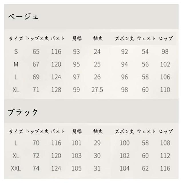 | サイズについての説明 | ベージュ(女性用) S トップス丈65 バスト116 ズボン丈92 ヒップ98 M トップス丈67 バスト120 ズボン丈95 ヒップ102 L トップス丈69 バスト124 ズボン丈97 ヒップ106 XL トップス丈71 バスト128 ズボン丈99 ヒップ110 ブラック(男性用) L トップス丈70 バスト116 ズボン丈100 ヒップ108 XL トップス丈72 バスト120 ズボン丈102 ヒップ112 2XL トップス丈74 バスト124 ズボン丈104 ヒップ116 ※サイズ表の実寸法は商品によって1-3cm程度の誤差がある場合がございます。 |