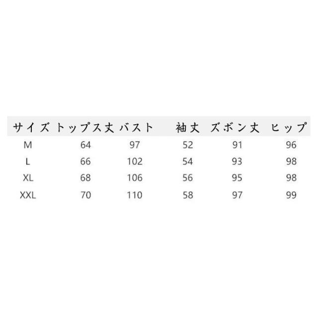 | サイズについての説明 | M トップス丈64 バスト97 袖丈52 ズボン丈91 ヒップ96 L トップス丈66 バスト102 袖丈54 ズボン丈93 ヒップ98 XL トップス丈68 バスト106 袖丈56 ズボン丈95 ヒップ98 2XL トップス丈70 バスト110 袖丈58 ズボン丈97 ヒップ99 ※サイズ表の実寸法は商品によって1-3cm程度の誤差がある場合がございます。 |