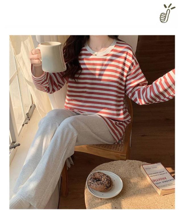 ルームウェア パジャマ 上下セット レディース カップ付き 長袖 綿 コットン ボーダー柄 ブラカップ付き クルーネック 丸首 ポケット付き 部屋着 寝巻き シンプル おしゃれ かわいい 修学旅行 春 秋 冬