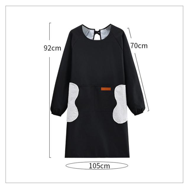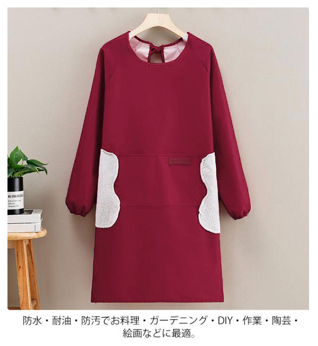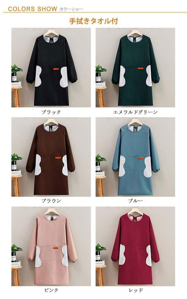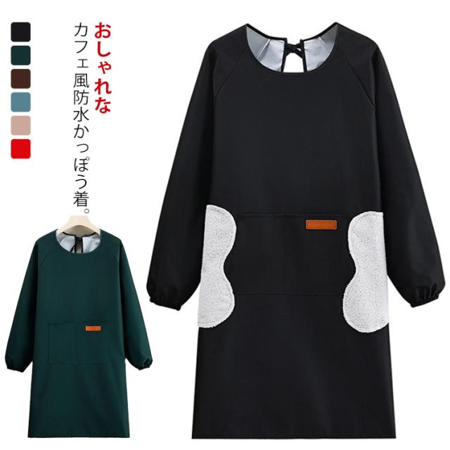 | おしゃれなカフェ風防水かっぽう着。 袖口ゴムで柔らかく適度なフィット感♪腕まくりしても締め付けません。 手拭きタオル付きタイプは調理中、汚れた手と濡れた手を拭くことができます。 フロントポケット付きなのでスマホなど小物収納にも便利な割烹着。 後ろリボン結びで着脱しやすい。 家事や料理はもちろん、学生さんの調理実習にも♪ 防水・耐油・防汚でお料理・ガーデニング・DIY・作業・陶芸・絵画などに最適。 | |