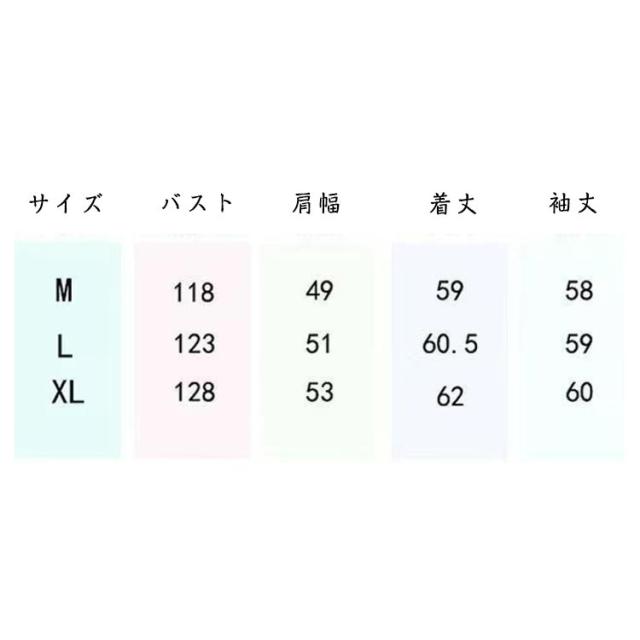 | サイズについての説明 | M バスト118 肩幅49 着丈59 袖丈58 L バスト123 肩幅51 着丈60.5 袖丈59 XL バスト128 肩幅53 着丈62 袖丈60 ※サイズ表の実寸法は商品によって1-3cm程度の誤差がある場合がございます。 |