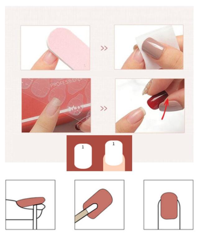 | サイズについての説明 | 12枚入り 〜取り付け方法〜 STEP1:ミニネイルファイルを使用して爪の表面を磨き、凹凸がない滑らかな状態にします。 STEP2:アルコール綿等で爪表面と手指を拭き取り、清潔で乾いた状態にしてください。 STEP3:粘着グミ全体のシートを開き、それぞれの爪のサイズに合う粘着を選びます。粘着グミ上のシートつまみを持ち、グミを台紙から剥がして自爪の根元に合わせながら、真っすぐ置いて貼り付けていきます。(※空気が入らないよう、指で空気を外に押し出すようにして隙間なくピッタリ貼り付けることが大切です。) STEP4:爪に貼った粘着上のつまみを持ってフィルムを剥がします。ネイルチップの根元部分を、甘皮より1〜2mm上の位置に斜めに貼り、空気を抜きながら甘皮の方向へ押し込むようにして装着します。 STEP5:数秒間ネイルチップを指で抑えて、しっかり密着させます。(STEP4〜5を全ての爪に繰返し行ってください。) 〜取り外し方法〜 STEP1:ぬるま湯を用意し、1〜2分程度指を浸してください。 STEP2:付属のウッドスティックでネイルチップ先端を押して根本に隙間をつくり、ゆっくり剥がしていきます。 STEP3:剥がれにくい箇所がある場合、再度ぬるま湯に指を浸してから剥がしてください。(※無理に剥がそうとすると、自爪が割れたり傷つく恐れがあるので、必ず慎重に行ってください。) STEP4:爪の表面に残った粘着グミは、付属のウッドスティックで絡めとるようにして取り除いてください。 |
