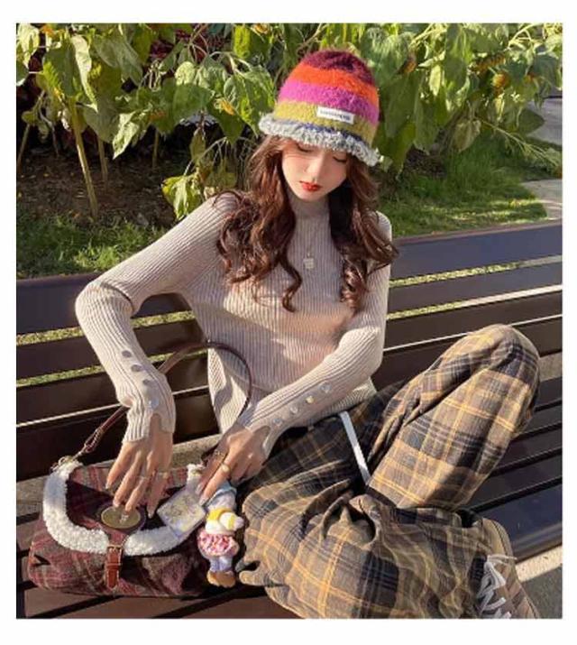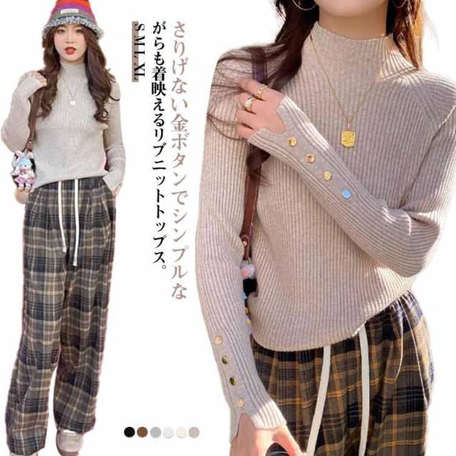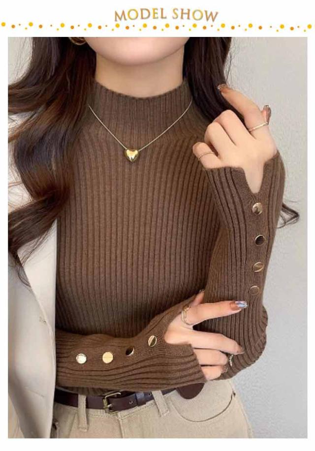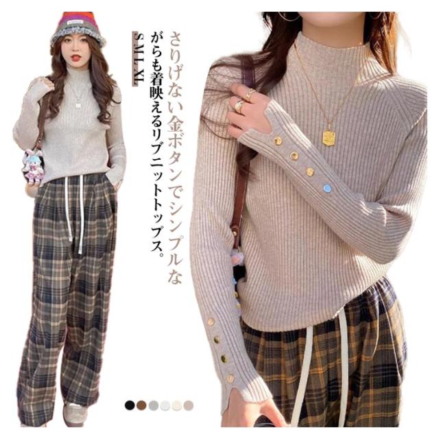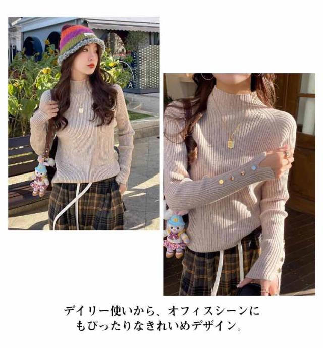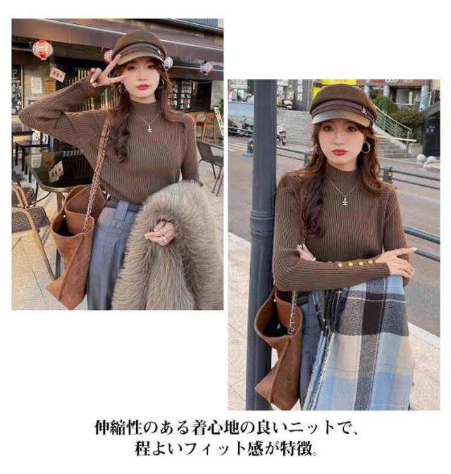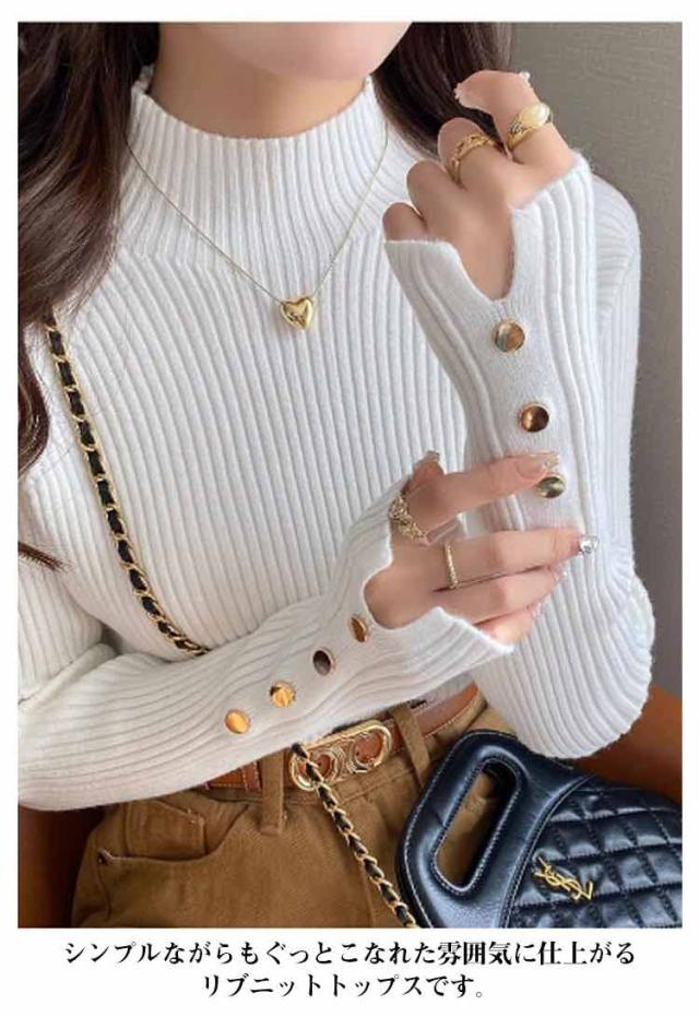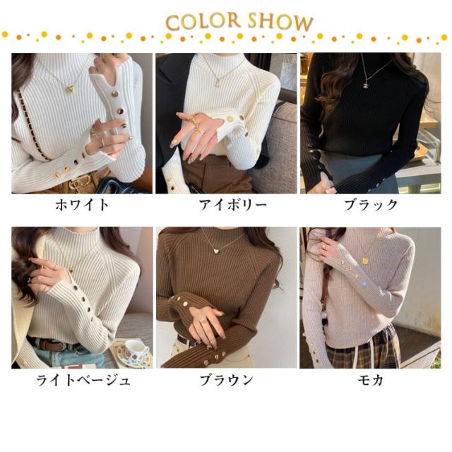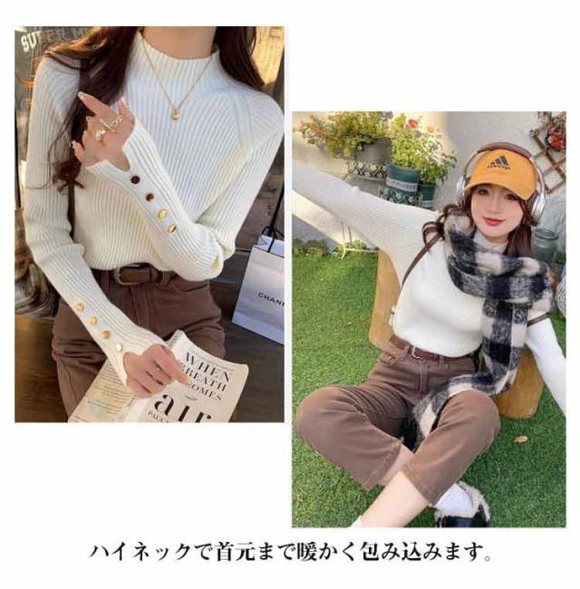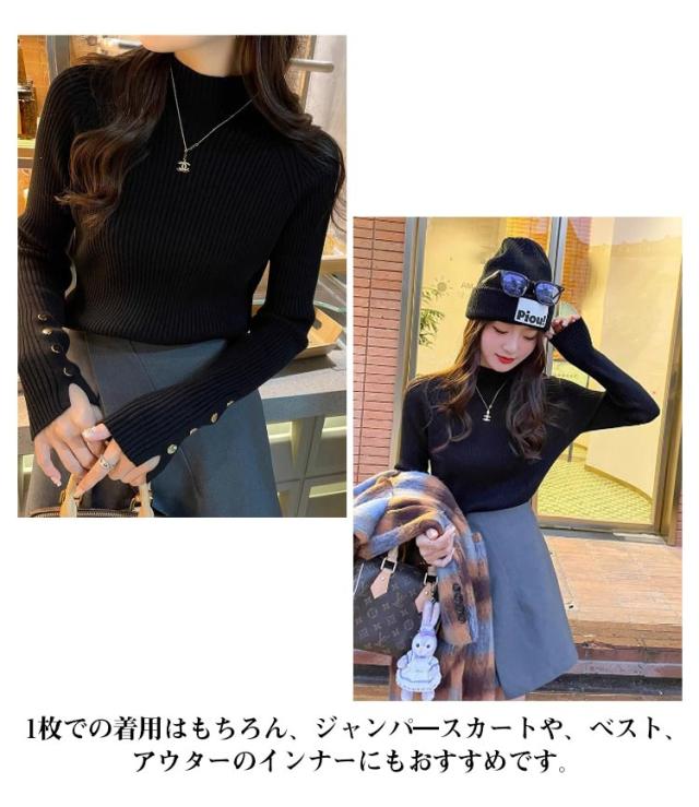 セーター ストレッチ ニット 秋冬 シンプル 袖ゴールドボタン トップス 保温 リブ プルオーバー ハイネック リブニット ハイネック インナー 下着 レイヤード 重ね着 金ボタン 長袖 防寒 あったか レディース 無地 タイト きれいめ おしゃれ