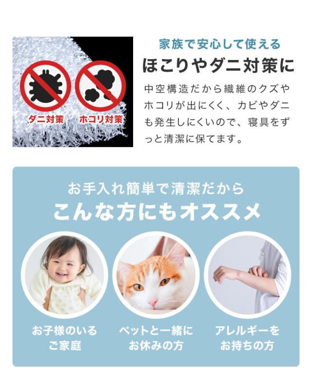 【中材】 ・手洗いをしてください。洗濯機のご使用はお避けください。 ・洗濯の際は中性洗剤と30℃以下のぬるま湯を使用してください。 ・タンブラー乾燥、天日干しはお避けください。風通しの良い日陰で乾かしてください。 【カバー】 ・タンブラー乾燥はお避けください。 ・カバーのみ取り外して洗うことができます。カバーのファスナーを閉じて洗濯ネットをご使用ください。 ・色移りを避けるため単独洗いを推奨しております。 へたりが気になった際の対処法:ふっくら感を取り戻したい時は、30℃程度のシャワーのお湯を3分ほどおかけください。 ※※※50℃以上のお湯をかけると品質の劣化に繋がりますのでご注意ください※※※ |