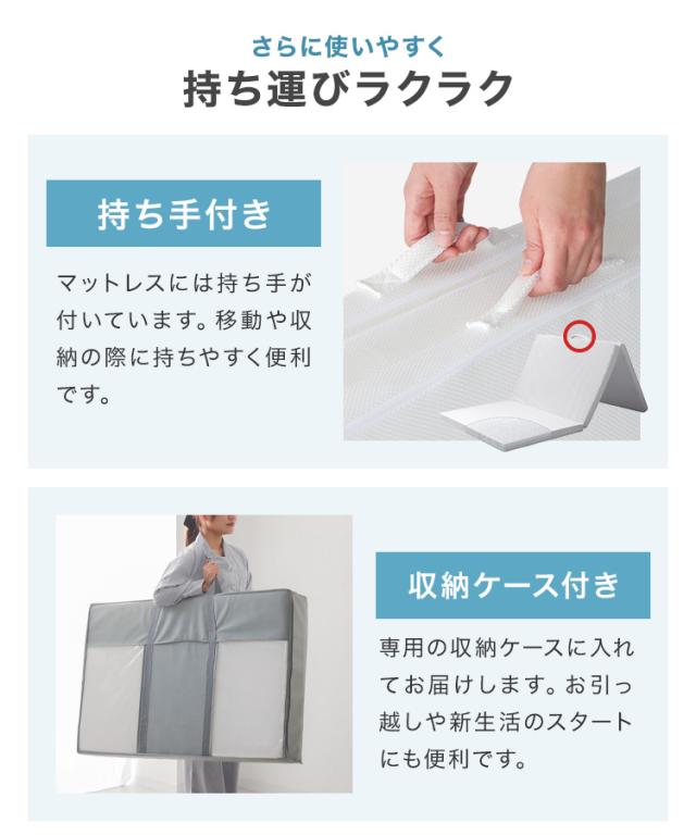 三つ折りマットレス は、サッと コンパクト に折りたためるので、 押入れなど、省スペースに収納しやすく、持ち運び にも便利!