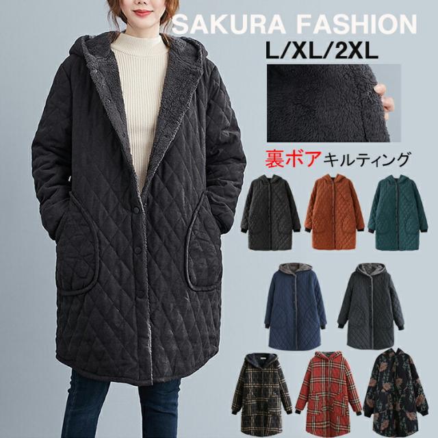 大きいサイズ L LL 3L ジャケット 裏ボア 冬 レディース コーデ コートフード付 アウター 中綿入り キルティング 長袖 あったか モッズコート ボアコート ロングコード 防寒 無地 ストライ