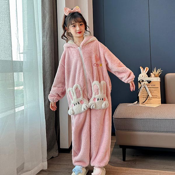 キッズパジャマ オールインワン うさ耳付き 長袖 ルームウェア フード付き 女の子 子供服 キッズ フランネル パジャマ 女の子 部屋着 もこもこ あったか ふわふわ 優しい肌触り厚手 保温 防寒 可愛い 暖か 秋冬