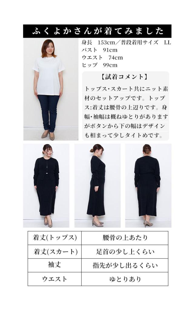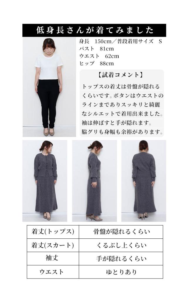 トップスの着丈は骨盤が隠れるくらいです。ボタンはウエストのラインまであり、スッキリと綺麗なシルエットで着用出来ました。袖は伸ばすと手が隠れます。ドロップショルダーで脇グリも身幅も余裕がありました。スカートの着丈はくるぶし上くらいです。ウエストは総ゴムで伸縮性があり少し余裕がありました。程よく広がるシルエットで体型を拾わず楽に着用出来ました。起毛した柔らかいニットであたたかく肌触り良かったです。ロングですがトップスが短めなのでスッキリして見えました。