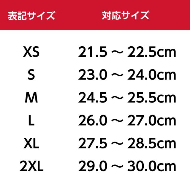 【サイズレンジ】XS(21.5-22.5cm) ,S(23-24cm), M(24.5-25.5cm), L(26-27cm), XL(27.5-28.5cm), 2XL(29.0-30.0cm)