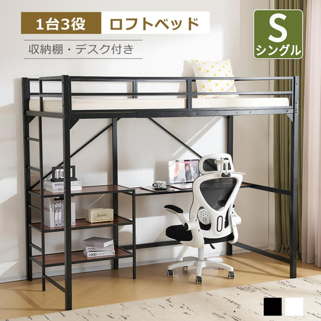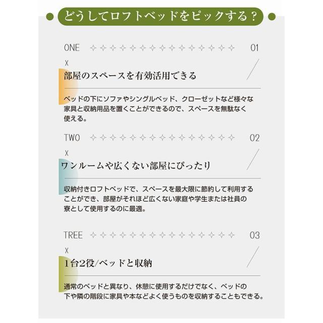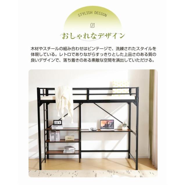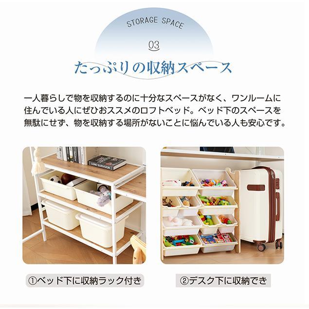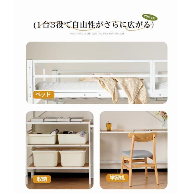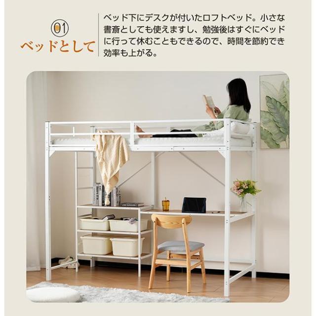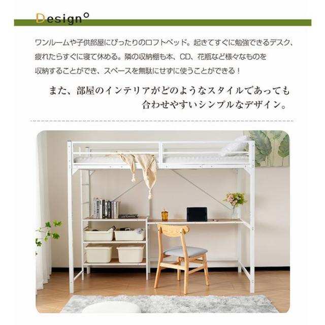 【1台3役で自由性がさらに広がる】ワンルームや子供部屋にぴったりのロフトベッド。起きてすぐに勉強できるデスク、疲れたらすぐに寝て休める。隣の収納棚も本、CD、花瓶など様々なものを収納することができ、スペースを無駄にせずに使うことができる!