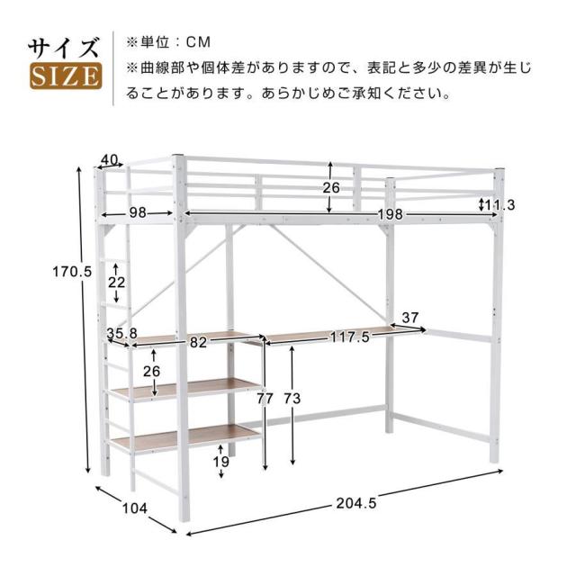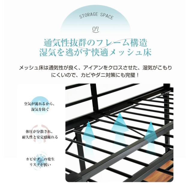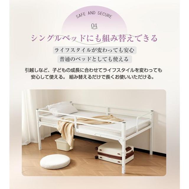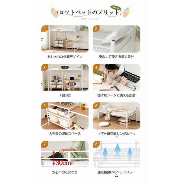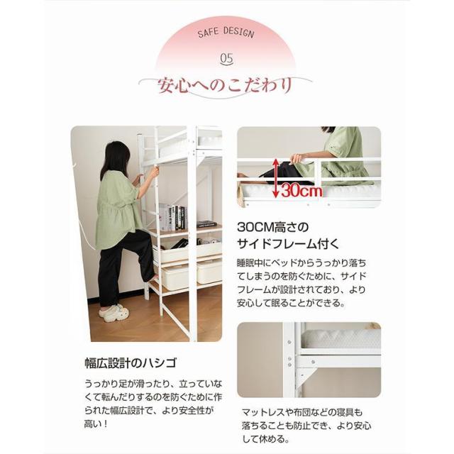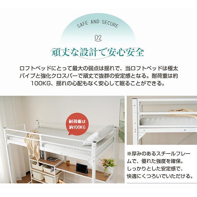 【頑丈な設計で安心安全】ロフトベッドにとって最大の弱点は揺れで、当ロフトベッドは極太パイプと強化クロスバーで頑丈で抜群の安定感となる。耐荷重は約100kg、揺れの心配もなく安心して眠ることができる。