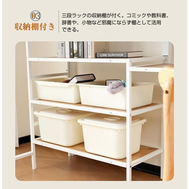 【収納棚付き】三段ラックの収納棚が付く。コミックや教科書、辞書や、小物など邪魔にならず棚として活用できる。