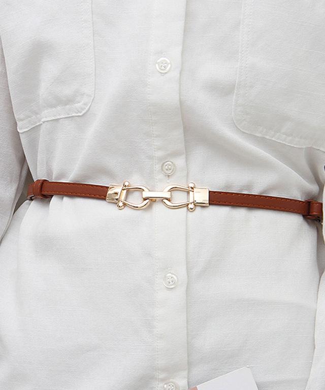 上品な光沢感のカーブバックルに、シンプルなPUレザーを組み合わせたきれいめデザインのベルト。