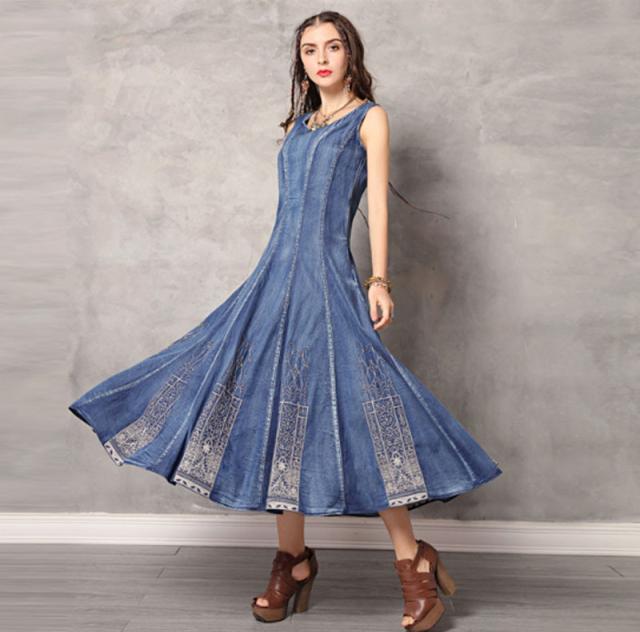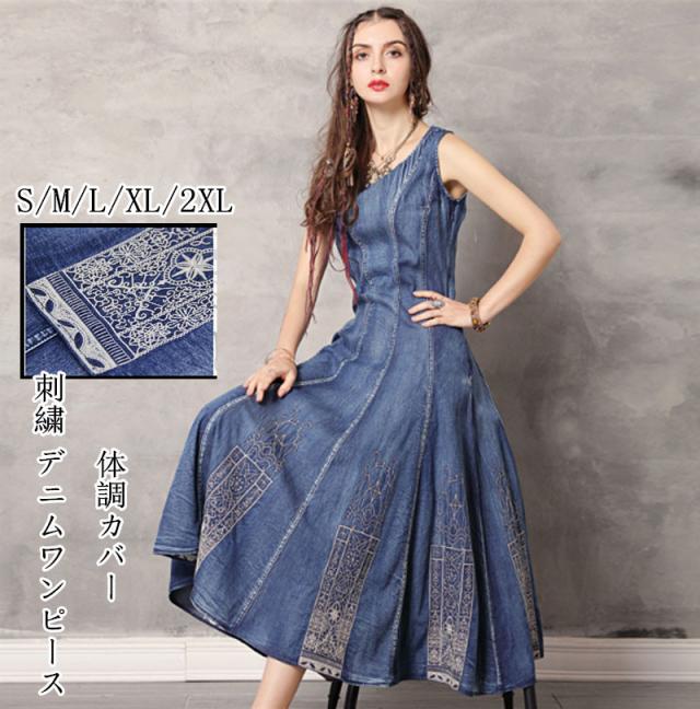 体型カバー ゆったり ワンピ ワンピース レディース マキシ丈 デニムワンピース ノースリーブ 刺繍 チュニック欧米風 エスニック