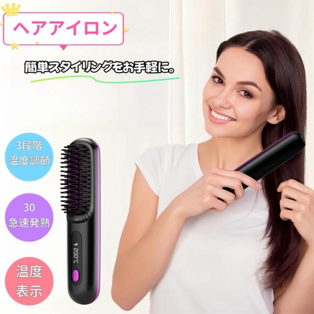 ヘアアイロン ヒートブラシ くし型 ストレートアイロン ミニブラシ マイナスイオン コードレス カールアイロン MAX200℃ 携帯 急速加熱 小型 軽量 美髪 縮毛矯正 ブラシアイロン充電式 男女兼用 温度表示 やけど防止 コンパクト 家庭 旅行 agesugi_ska
