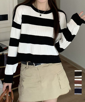 長袖 ボーダー柄ニット ドロップショルダー ニットソー 着回し セーター クルーネック 通勤通学 オフィスカジュアル ニットプルオーバー ニットウェア 配色