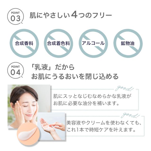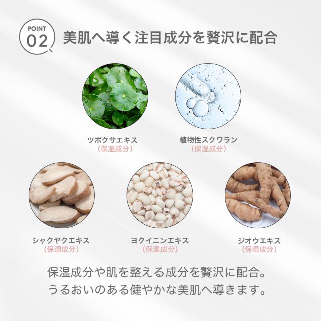 その他成分:濃グリセリン、1,3-ブチレングリコール、オリブ油、植物性スクワラン、ソルビット液、パルミチン酸イソプロピル、ポリオキシエチレン硬化ヒマシ油、粘度調整剤、親油型モノステアリン酸グリセリル、モノステアリン酸ソルビタン、pH調整剤、ヒドロキシエタンジホスホン酸四ナトリウム液、パラオキシ安息香酸メチル、パラオキシ安息香酸プロピル、プロピレングリコール、ヨクイニンエキス、ジオウエキス、シャクヤクエキス、センキュウエキス、トウキエキス(1)、ツボクサエキス