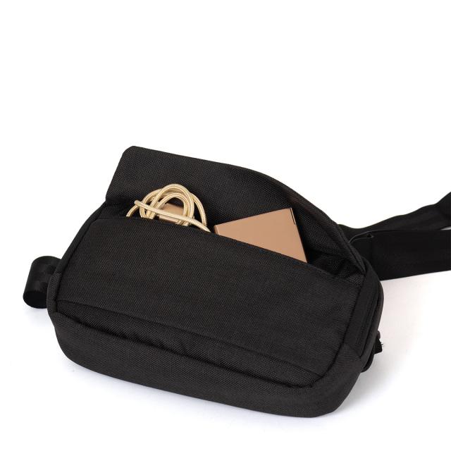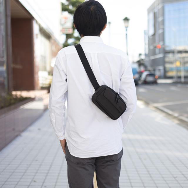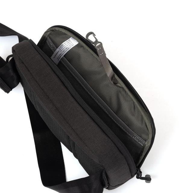 メインコンパートメントは一般的な長財布が入る大きさを要し、荷物を整理しやすくするメッシュポケットやキーフックを設置。バックパネルには、起毛した裏地で作られたモバイルフォンの収納に適したアクセサリーポケットを装備するなど、あらゆるシーンでマッチするデザイン設計が魅力的な逸品。
