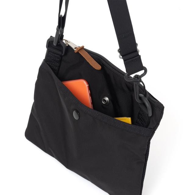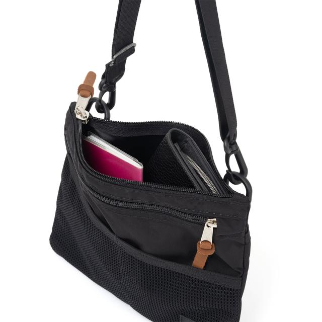 グレゴリーがサコッシュをつくったらこうなると断言できるほど、随所に“らしさ”があるモデルです。まず、素材はデイパックなどにも使われている厚めの生地を選択。フロントのメッシュポケットも同じく斜めのカッティングを施したデザインに。これはアプローチ面積の広がりとなり、使いやすさも付随します。また、ジッパープルも皮革。デイパックがそのままサコッシュになったようなスタイルです。