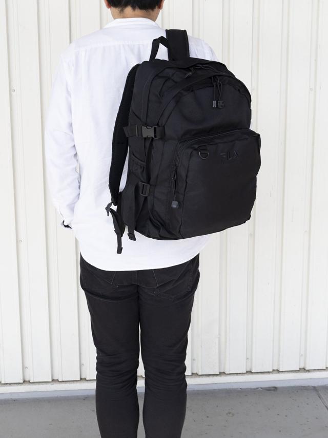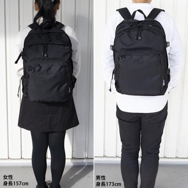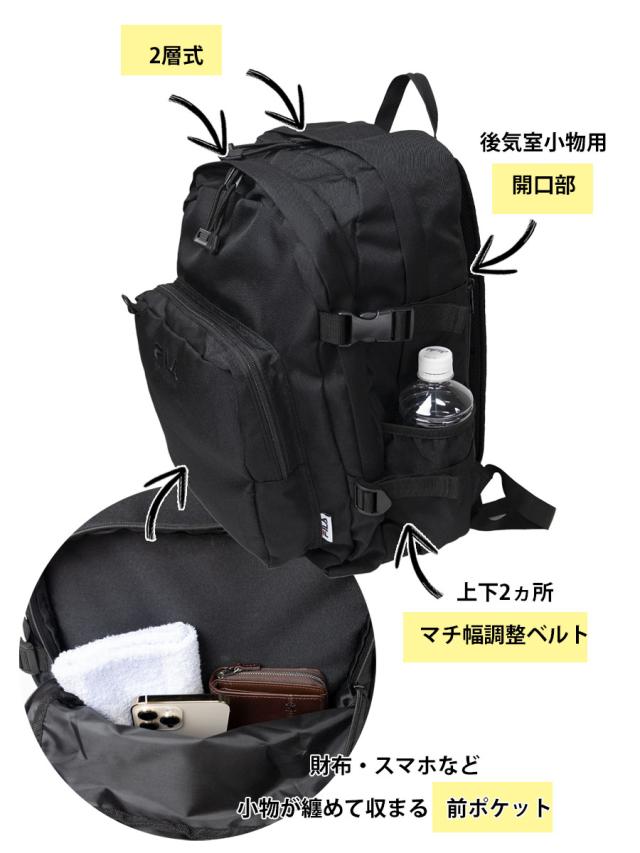 ■スポーツブランドFILAの30L大容量デイパックです。2層に分かれたマチ幅がしっかりあるデザインで女性でも背負いやすくなっています。荷物が少ない時はマチ幅調整ベルトで絞ることができます。