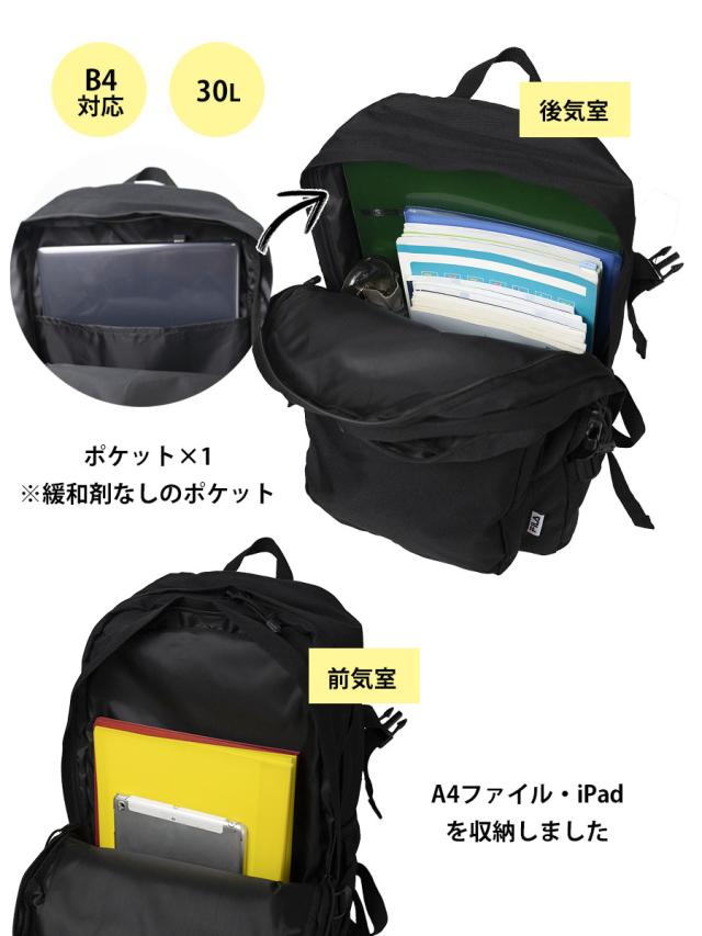 ■リュックベルト、背面ともしっかりとクッションが効いています。チェストバンドもついているので自転車や雨の日なども快適にお使いいただけます。通勤通学にお勧めです。大容量なので、部活動・修学旅行・自然学校・合宿・出張等宿泊や着替えの持ち歩きにも対応できます。