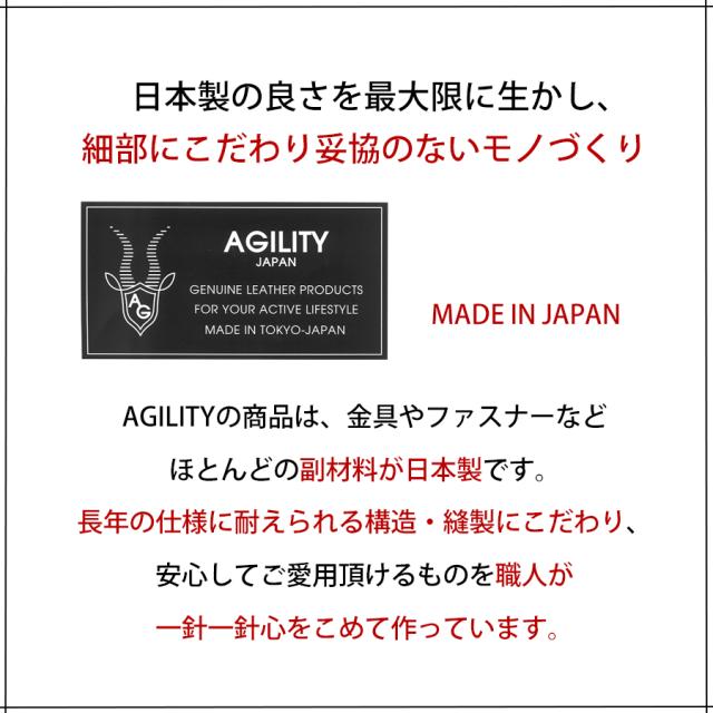 日本製の良さを最大限に生かし細部に拘り妥協のないモノづくりを目指すAGILITYの商品です。金具やファスナーなどの副材料はほとんどが日本製で長年の仕様に耐えられる構造・縫製に拘り安心してご愛用頂けるものを職人が一針一針心を込めて作っています。